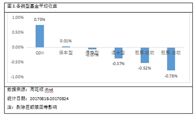 据众禄研究中心统计,本期(20170818-20170824)可统计的产品中主动股票型基金产品平均下跌0.78%,指数型产品平均下跌0.52%,混合型基金产品平均下跌0.37%,债券型基金产品平均下跌0.07%,保本型基金产品平均上涨0.01%,QDII基金产品平均上涨0.75%。